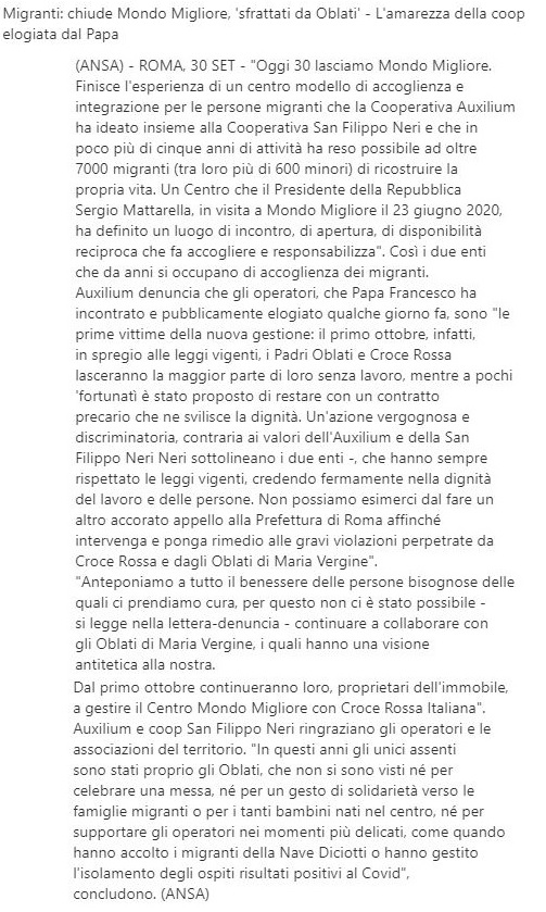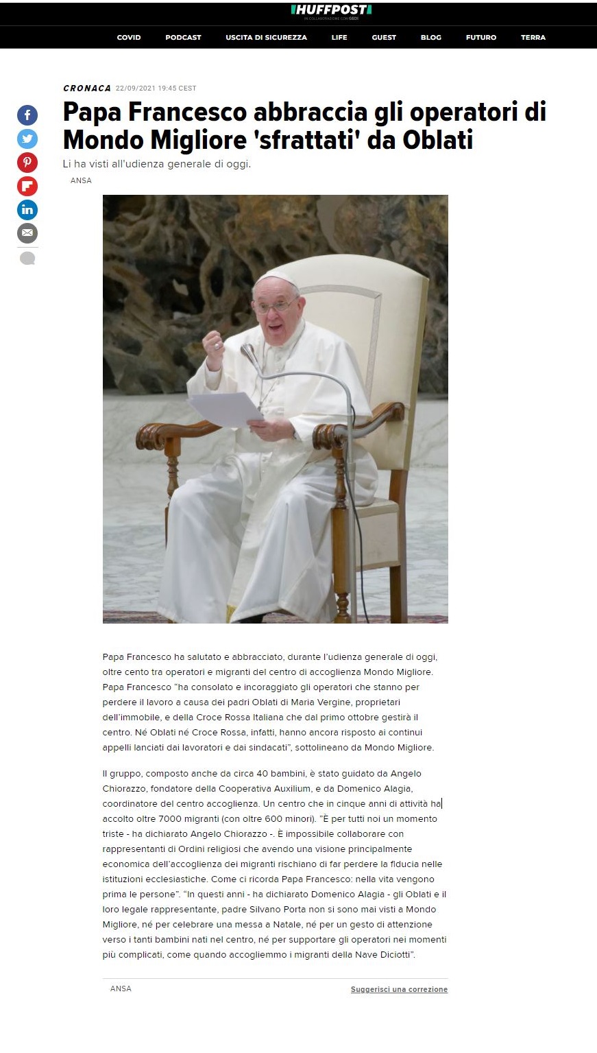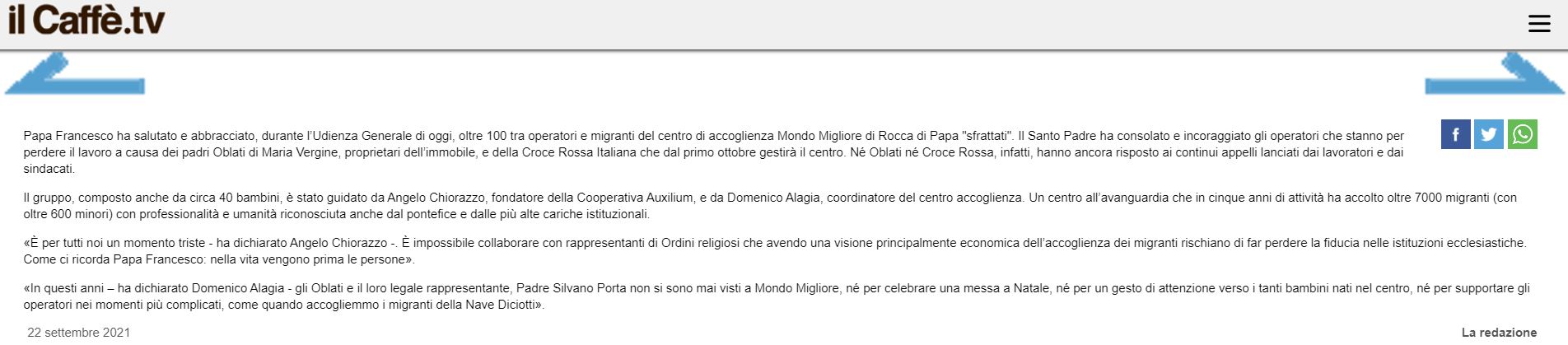 Il Papa si è poi fermato a lungo con il gruppo, che era guidato da Angelo Chiorazzo e da Domenico Alagia coordinatore di Mondo Migliore: i bambini hanno consegnato a Papa Francesco un album di letterine che avevano scritto per lui e Hamida Sager, una pittrice libica ospite di Mondo Migliore, ha donato al Pontefice un ritratto. Papa Francesco senza fretta ha ascoltato con attenzione tutti, soprattutto gli operatori di Mondo Migliore, i quali gli hanno raccontato come, dopo aver riportato a nuova vita un centro spirituale dalla storia gloriosa ma ormai chiuso da anni, dopo averlo trasformato con il loro impegno nel miglior centro accoglienza migranti che esiste in Italia e in Europa, dopo aver accolto e integrato oltre 7000 persone, stanno per perdere il lavoro a causa del comportamento degli Oblati di Maria Vergine, che non condividono la visione di Auxilium, per la quale l’attenzione alla persona e il prendersi cura dei più deboli viene prima di tutto, anche del profitto.