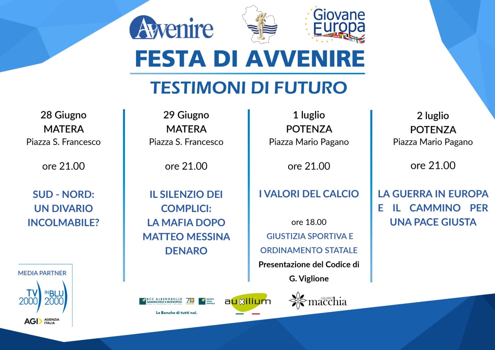 La Festa di Avvenire in Basilicata è ormai annoverata tra gli eventi più interessanti del panorama culturale del Mezzogiorno. Sono stati ospiti di questo appuntamento Romano Prodi, Antonio Tajani, Claudio Descalzi, Annamaria Furlan, Federico Cafiero De Raho, Nicola Gratteri, Franco Anelli, Paolo Rotelli, Enrico Letta, Giulio Tremonti, Leoluca Orlando, i cardinali Pietro Parolin, Lorenzo Baldisseri, Marcello Semeraro, Matteo Zuppi e Mauro Gambetti, Gualtiero Bassetti, Mario Zenari e Luis Antonio Tagle. La Festa viene supportata, anche quest’anno, dalla Cooperativa Sociale Auxilium, dalla Banca di Credito Cooperativo di Alberobello, Sammichele e Monopoli, e dal Gruppo Macchia di Potenza.