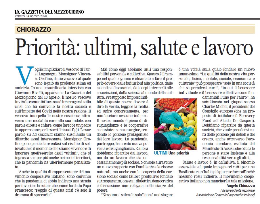 "Voglio ringraziare il vescovo di Tursi Lagonegro, Monsignor Vincenzo Orofino, il mio vescovo, al quale sono legato da profonda stima ed amicizia. In una straordinaria intervista con Giovanni Rivelli, apparsa su La Gazzetta del Mezzogiorno del 10 agosto, il nostro vescovo invita la comunità lucana ad interrogarsi sulla crisi che ha coinvolto la nostra società e sull’impatto del Covid nella nostra regione. Il vescovo interpella le nostre coscienze attraverso una modalità cara alla sua indole: con parole dirette e chiare, come farebbe un padre in apprensione per le sorti dei suoi figli. Le sue parole su La Gazzetta stanno suscitando un dibattito assai interessante. E, anche in qualità di rappresentante del movimento cooperativo italiano, sono convinto che la pandemia ci abbia indicato una strada per invertire la rotta e che, come ha detto Papa Francesco: 'Peggio di questa crisi c'è solo il dramma di sprecarla'"