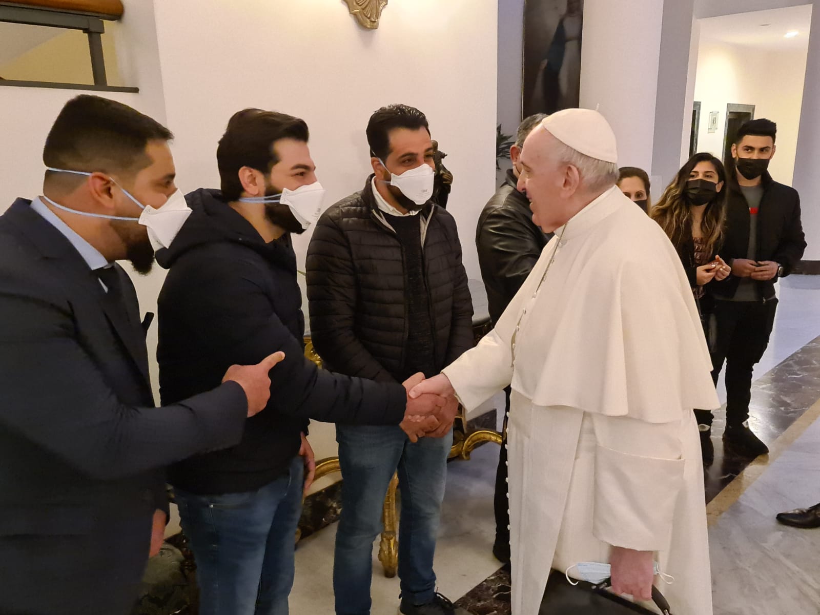 Papa Francesco, nel lasciare Casa Santa Marta, poco prima della sua partenza per l'Iraq, si è intrattenuto con un gruppo di persone accolte dalla Cooperativa Auxilium rifugiatesi in anni recenti in Italia dall’Iraq. Insieme a loro c’era anche Angelo Chiorazzo, il fondatore della cooperativa Auxilium.