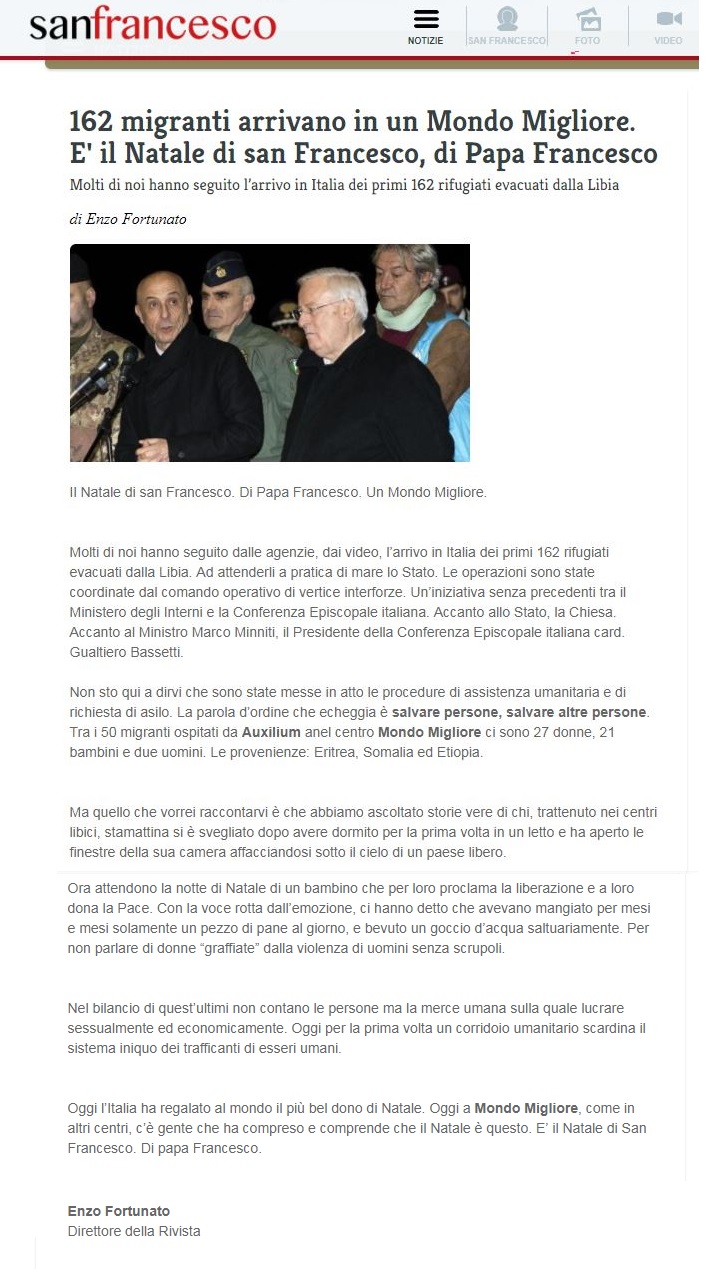 Padre Enzo Fortunato, direttore della Sala stampa del Sacro Convento di Assisi, ha scritto un articolo per la rivista San Francesco nel quale sintetizza il valore di questo passaggio con un corridoio umanitario dalla detenzione in Libia a un Mondo Migliore. Nel suo articolo padre Enzo Fortunato spiega: “Non sto qui a dirvi che sono state messe in atto le procedure di assistenza umanitaria e di richiesta di asilo. La parola d’ordine che echeggia è salvare persone, salvare altre persone.