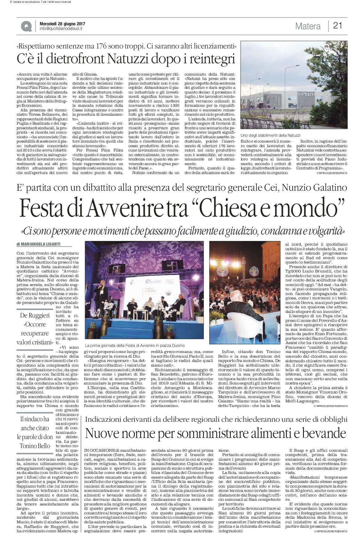 La Festa di Avvenire si è aperta con un’approfondita riflessione sul rapporto tra Chiesa e Mondo. A discuterne sul palco il Segretario generale della C.E.I. monsignor Nunzio Galantino, il direttore di TV2000 Lucio Brunelli, padre Enzo Fortunato, direttore della rivista San Francesco d'Assisi e a concludere è stato mons. Vincenzo Orofino vescovo della Diocesi di Tursi-Lagonegro.