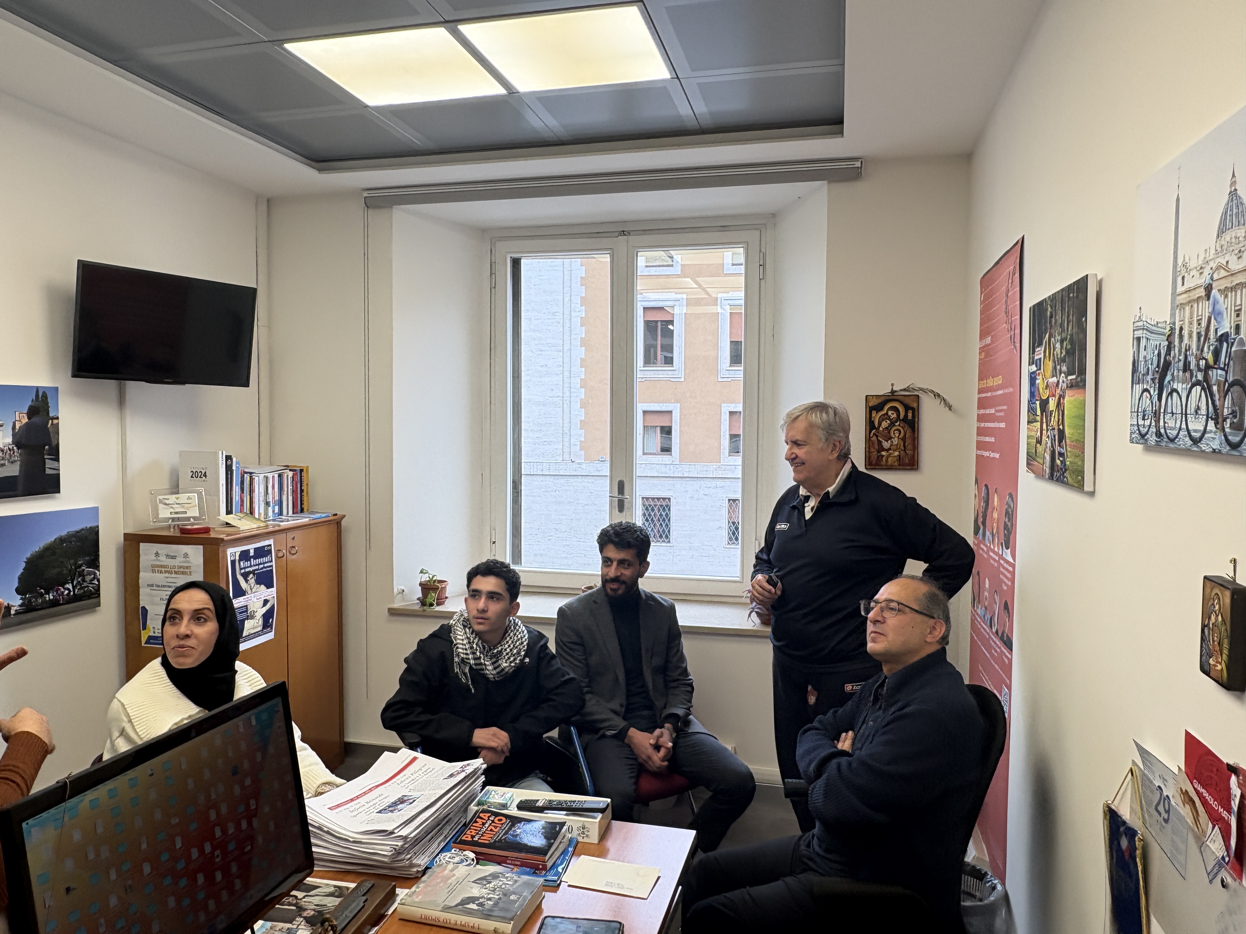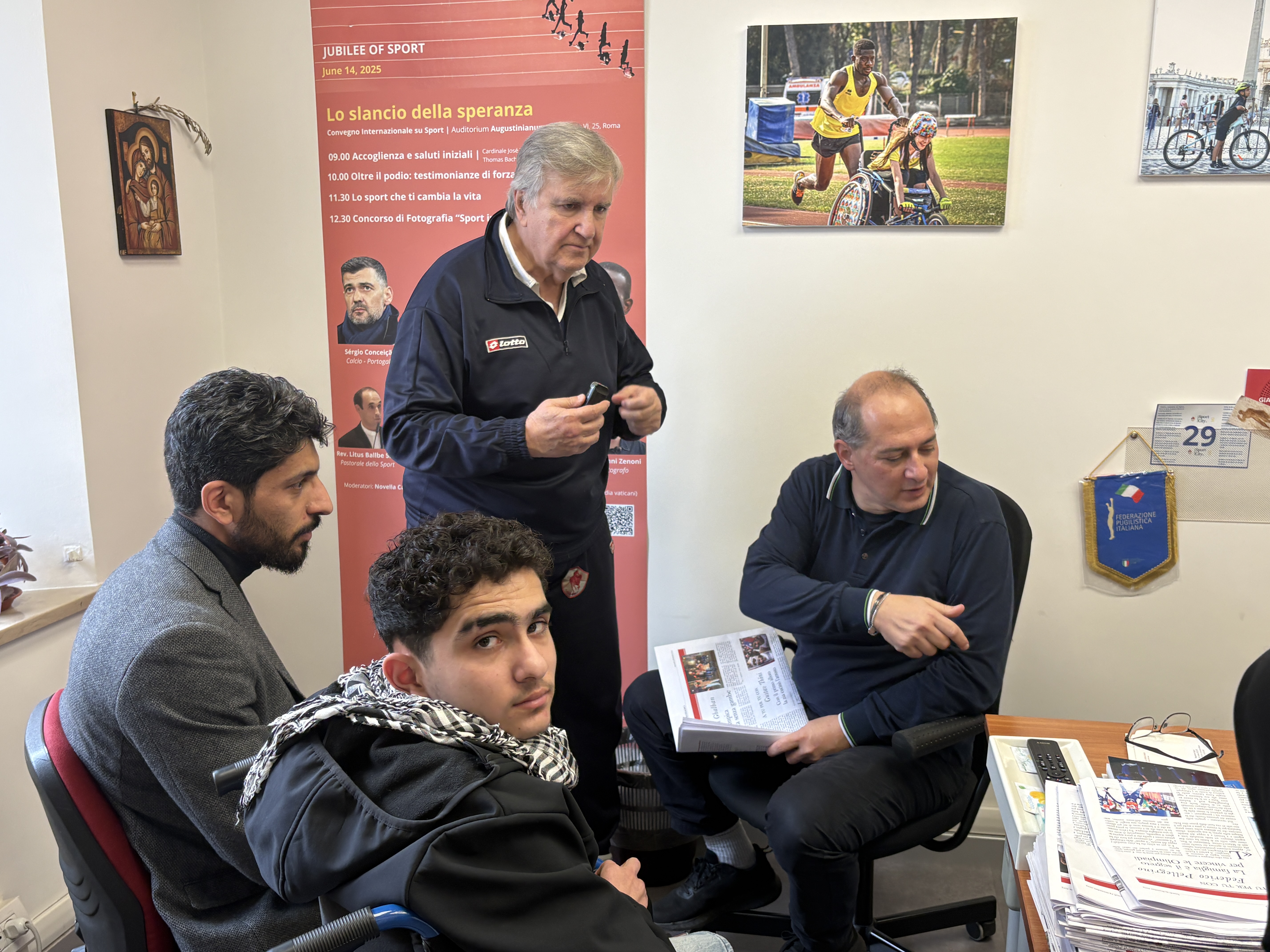 L'intervista di Giancarlo La Vella e Giampaolo Mattei (presidente di Athletica Vaticana) ad Ahmad Al Ghalban è emozionante e drammatica, A tradurre il racconto del ragazzo è stato un altro giovane palestinese (con un passato da rifugiato e oggi cittadino italiano) Ahmad Taha, coordinatore Auxilium delle case famiglia per minori del Protettorato San Giuseppe.
