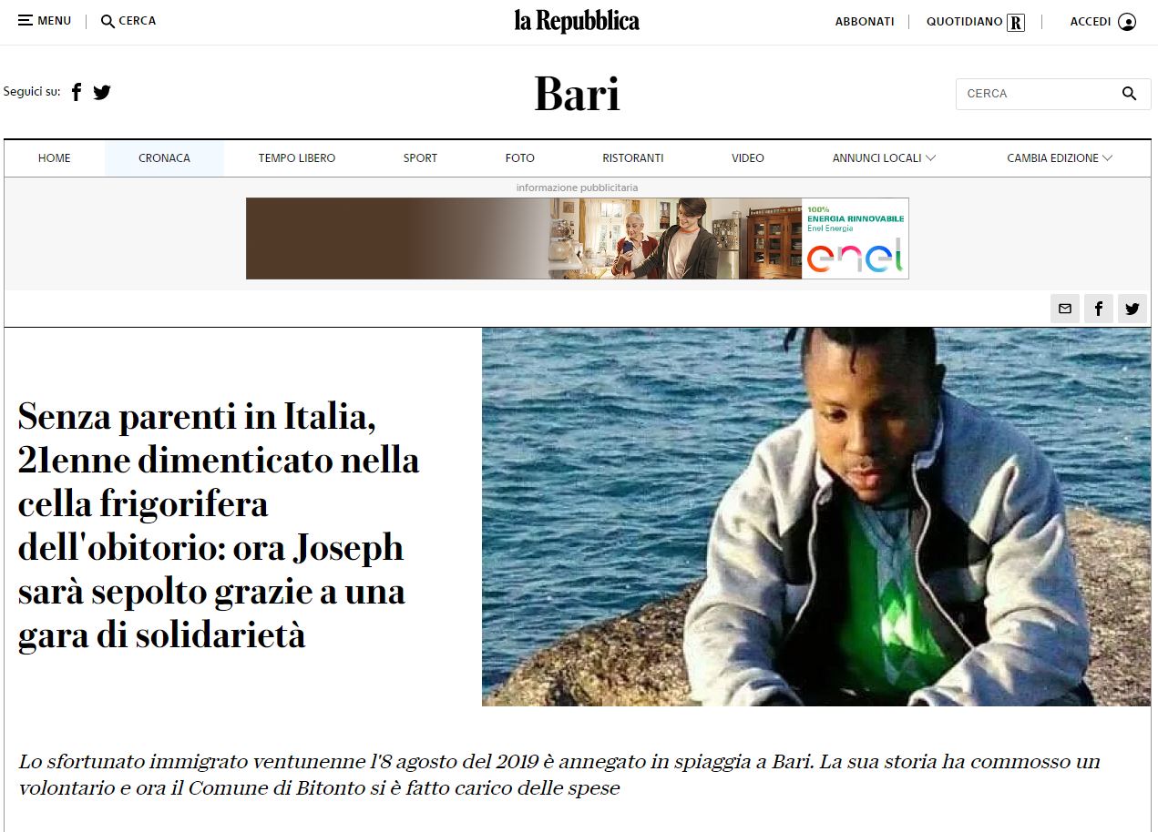 La storia di Joseph, un giovane migrante dimenticato nella cella frigorifero dell'obitorio che ora potrà essere sepolto grazie ad un gesto di solidarietà. Di seguito l'articolo de La Repubblica di Bari.